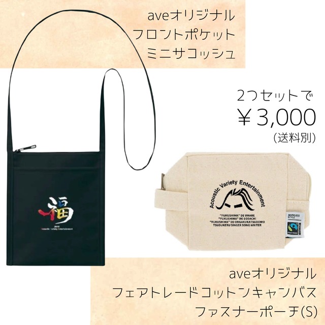 【aveオリジナルフロントポケットミニサコッシュ】 サイズ/横幅16cm・縦幅18cm・ショルダー115cm 素材/ポリエステル、他 【aveオリジナルフェアトレードコットンキャンバスファスナーポーチ(S)】 サイズ/横幅12cm・縦幅12cm・マチ6cm 素材/コットン